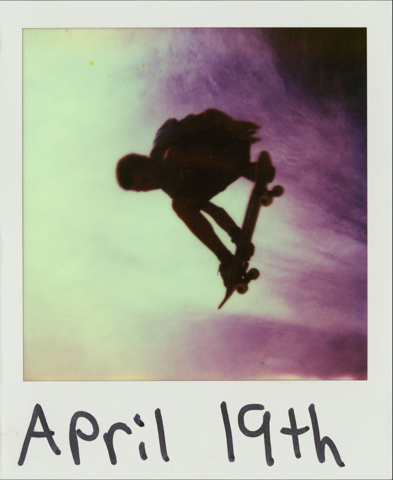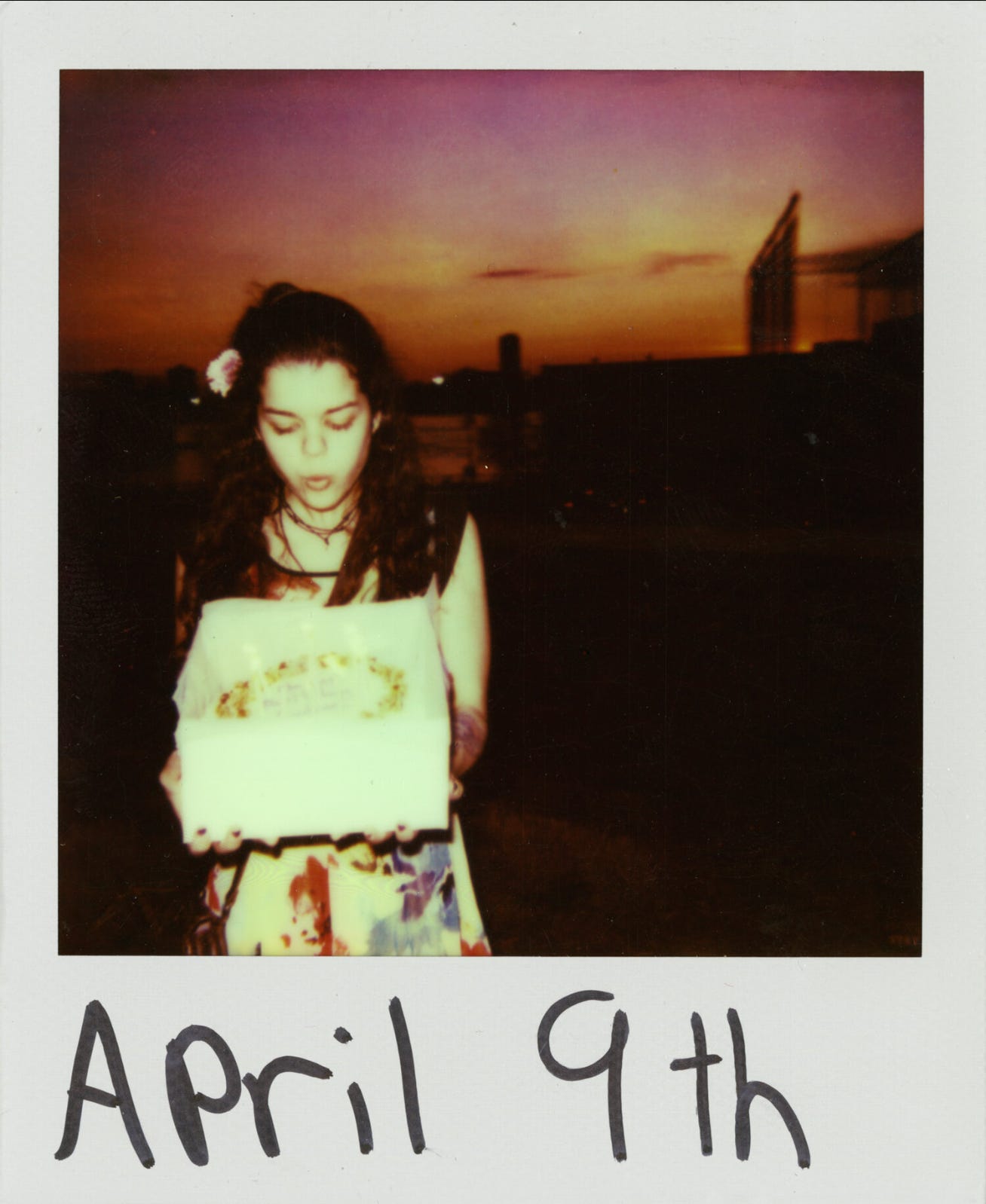 Fotografia de pe 9 Aprilie este un bun exemplu pentru acest aspect. Este în format pătrat, înrămată de marginea albă tipică unei fotografii Polaroid. O fată suflă în lumânările de pe un tort aniversar pe care îl ține în mână. În spatele ei se vede un oraș la apus: în timp ce terenul este întunecat, doar siluetele clădirilor fiind vizibile, cerul este luminat în nuanțe de mov, roz, galben și oranj. Între portret și fundal este un contrast închis-deschis care le distanțează. Culorile sunt uniforme, aceleași tonuri ale cerului regăsindu-se în rochia fetei dar și în umbrele de pe corpul acesteia, care devin portocalii. Catifelarea contururilor, culorile omogene dar și subiectul contribuie la aspectul nostalgic al fotografiei. Rochia, floarea din păr și bijuteriile sugerează că protagonista celebrează ceva. Ținerea unui tort aniversar sugerează prezența unor invitați și la fel fac și baloanele, coifurile sau chiar actul de a fotografia: cineva este acolo să sărbătorească cu tine. Cum majoritatea amintirilor plăcute includ alți oameni, mai ales când viața de zi cu zi este marcată de timp solitar la muncă, privitorului îi sunt amintite întâlnirile speciale care îl sustrag din cotidian.