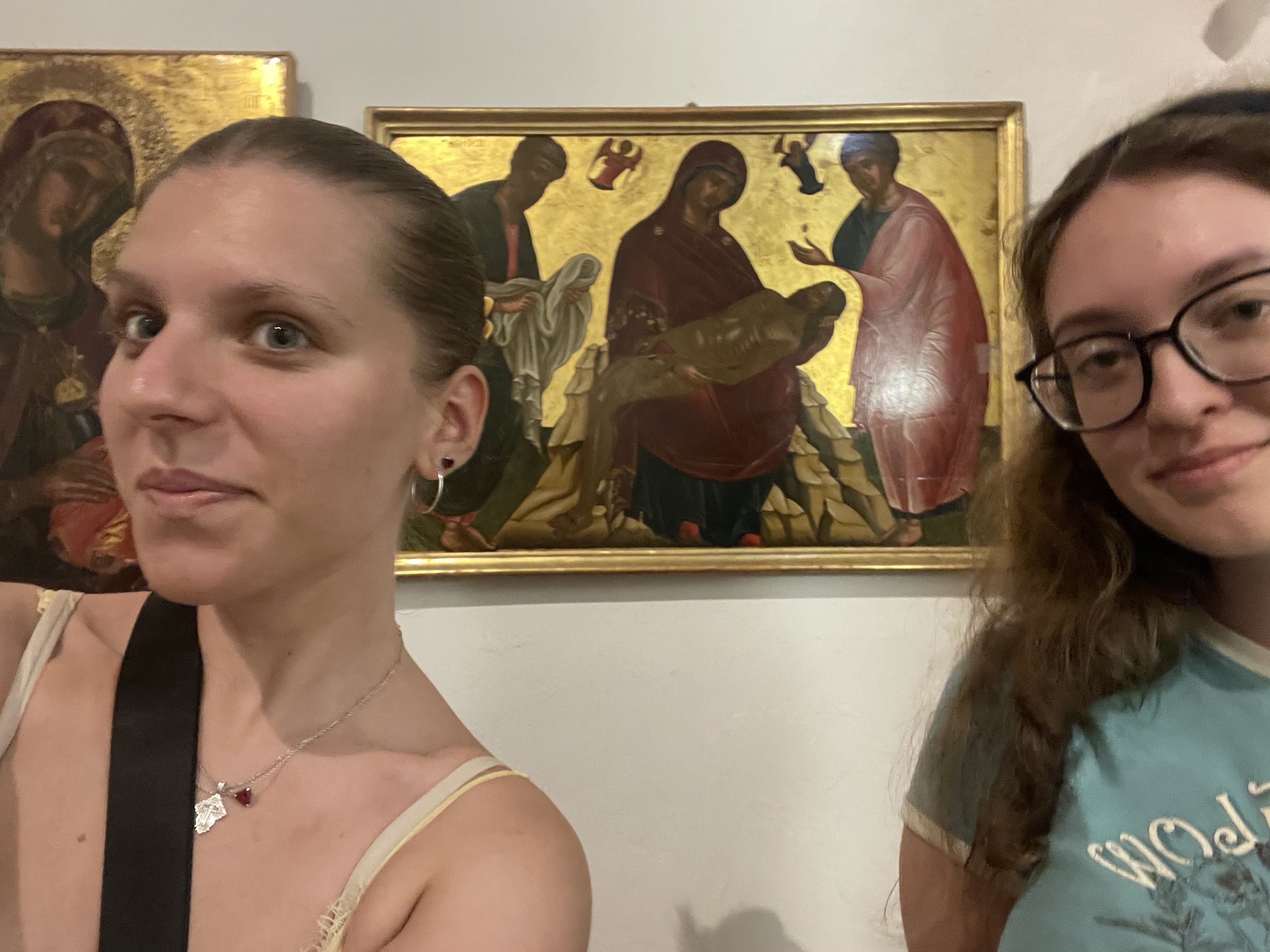 În spatele nostru se află o icoană italo-cretană cu care aveam amintiri cu mult înainte să o vedem. Am studiat-o în sesiunea de vară la Istoria artei românești ca parte dintr-un context mai larg al reprezentărilor giulgiului lui Hristos în icoane cu Plângerea și Punerea în Mormânt. Eram deci deja familiare cu fiecare detaliu și cunoșteam în special fiecare fald al drapajului, istoricul icoanei (al acestui tip de icoane), comunitățile cărora le servea și discursul teologic/iconografic în care se încadrează. Într-o scurtă vizită la Padova, cu intenția de a vizita Capela Scrovegni, am intrat în Museo Eremitani, fără vreo idee despre ce conține colecția. Asta a fost chiar prima lucrare cu care ne-am întâlnit. Văzând-o încă de pe hol, prin ușa de sticlă, i-am spus Marei: “Nu o să îți vină să crezi ce o să vedem” iar apoi am avut amândouă reacții tipice mai degrabă unei întâlniri cu prieten pe care nu l-ai mai văzut de mult decât cu un obiect.