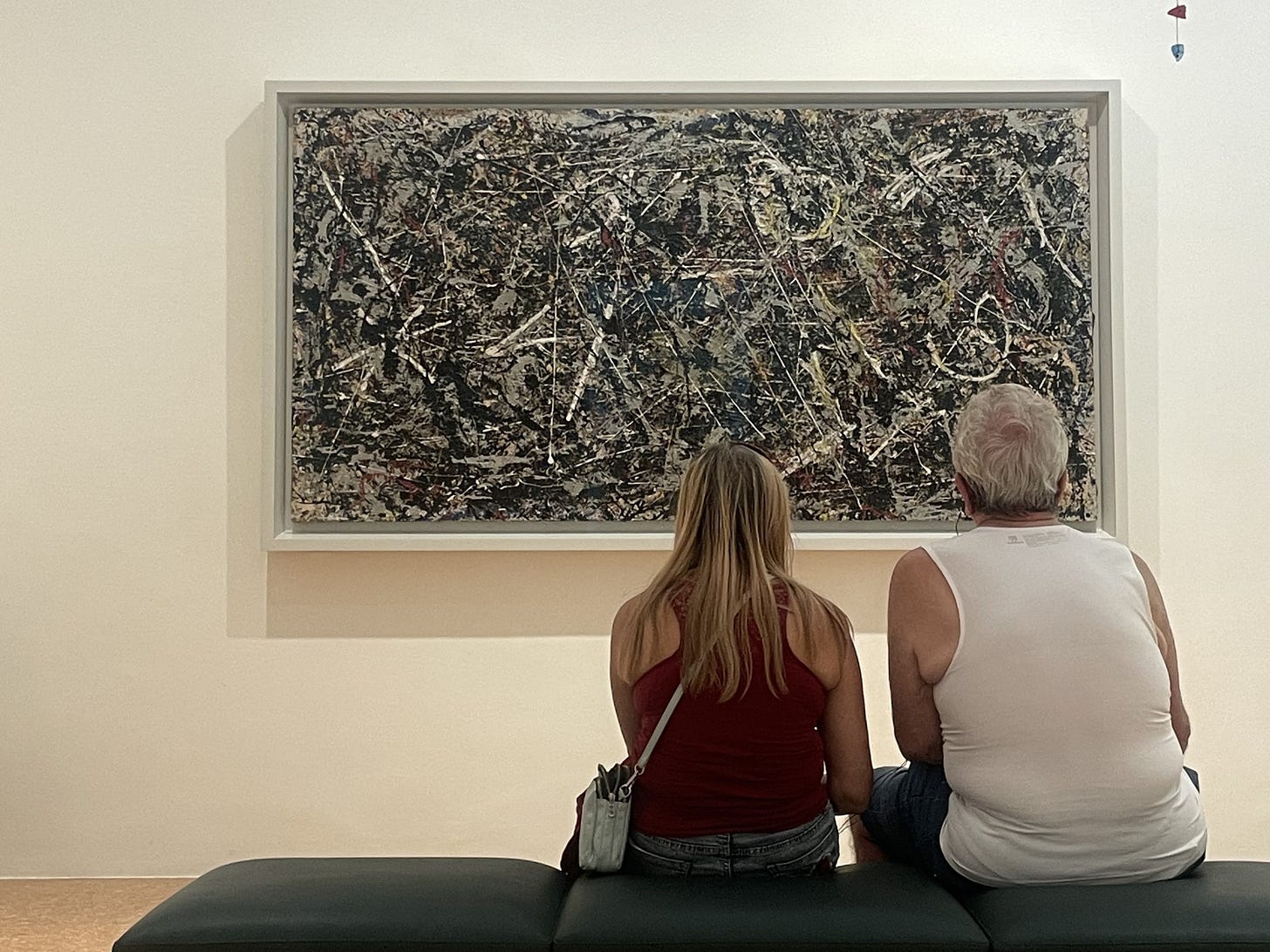 Tot la capitolul emoții de muzeu aș vrea să vorbesc și despre fotografia unui cuplu în fața unui Pollock din colecția Guggenheim. După multe zile cu ore de somn pierdute și un mic dejun îndoielnic, am devenit puțin amețită în timp ce vizitam colecția (sunt în general victima museum fatigue). M-am îndreptat spre prima bancă și, așteptând să mă simt mai bine, am avut ocazia să stau mai mult decât aș fi stat în mod normal într-o cameră cu Expresionism Abstract. Recunosc că trecusem deja o dată prin sala asta și că, în afară de sentimentul menționat anterior de a vedea ceva despre care ai învățat la facultate și de activarea unei conștiințe istorice în fața unei imagini al cărui impact cultural îl cunoști, nu prea m-a mișcat personal, cum am înțeles că ar trebui să o facă lucrările lui Pollock. Am fost astfel fascinată de cuplul care, ascultând ghidul audio, nu și-au dezlipit privirea de la lucrare mai bine de 10 minute. Poate aflau pentru prima oară ce eu știam deja, iar opera era doar o variantă mai clară a unui power-point pe care sunt proiectate date istorice și detalii personale despre Pollock sau poate chiar simțeau ceva. Nu pot decât să mă întreb.